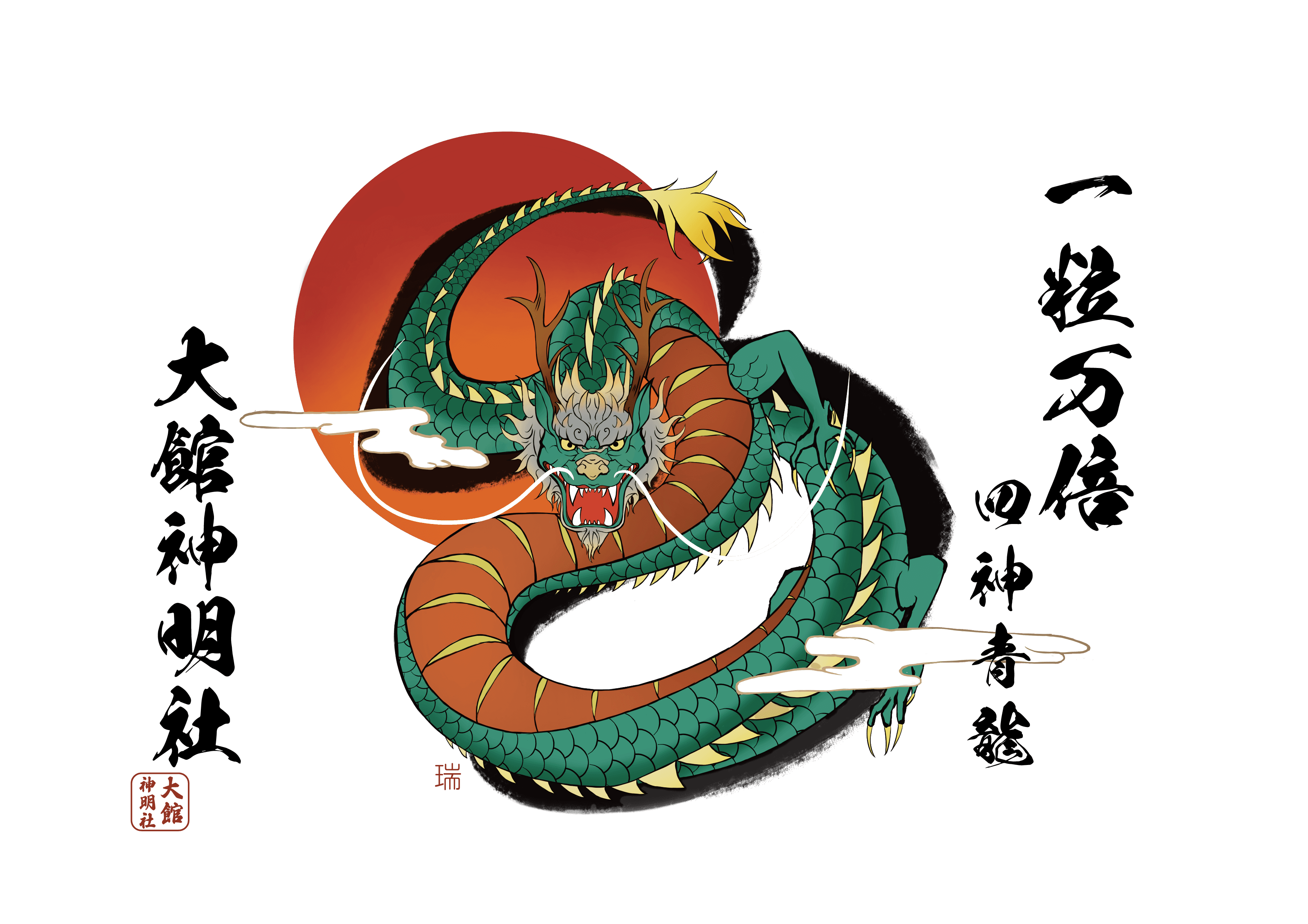 大館神明社様の干支絵馬デザイン 2024年と2025年の干支絵馬を制作。2024年は辰年の絵馬に参拝者を見守る思いを込め、2025年は災害から人々を守り、竹のように力強く成長する未来を願い、蛇をデザインしました。